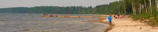 ![]() Clearwater Beach on Lac La Loche within the Clearwater River Dene Nation Cultural Grounds. A pall of smoke from nearby forest fires obscures the sky. |