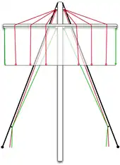 Buntlines lift the middle portion of the sail, or "bunt"; there will usually be four to eight buntlines across the foot of the sail. Traditionally they are secured to the sail with buntline hitches.[1] Since buntlines only have to lift a section of canvas, they can be thinner than the clewlines and are not usually fitted with a purchase. A typical arrangement for the buntlines has them running through deadeyes on the yard, upwards to a block fixed to the shrouds a little higher up the mast, and then downwards against the inside of the ratlines to the deck. This provides a good lead but does create a minor obstacle to sailors moving out along the yards.