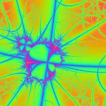 Pickover stalks are certain kinds of details that are empirically found in the Mandelbrot set in the study of fractal geometry. In the 1980s, Pickover proposed that experimental mathematicians and computer artists examine the behavior of orbit trajectories for the Mandelbrot set in order to study how closely the orbits of interior points come to the x and y axes in the complex plane. In some renditions of this behavior, the closer that the point approaches, the higher up the color scale, with red denoting the closest approach. The logarithm of the distance is taken to accentuate the details. This work grew from his earlier work with Julia sets and "Pickover biomorphs," the latter of which often resembled microbes.[27][28]