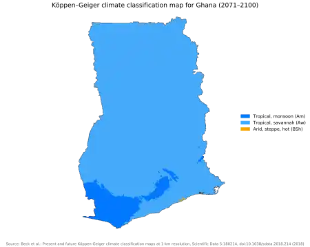 However, when one compares the Köppen-Geiger climate classification map for 1980–2016 and the projected map for 2071–2100 predicted change in classification from "tropical, savannah" to "arid, steppe, hot" in some coastal areas."