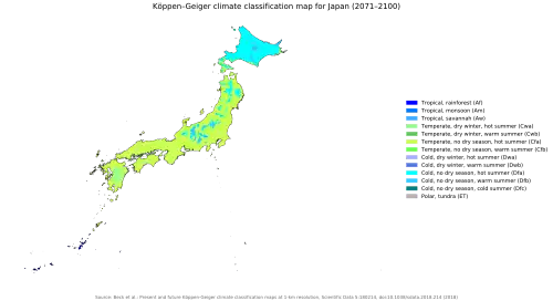Water resources are highly dependent on the country’s rates of precipitation and evapotranspiration.[22] Temperature projections in Japan are increasingly affecting both water cycle processes, hurting the availability of water resources for Japan.[22] The effect of climate change upon water availability in Japan includes: