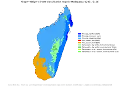 Climate change is projected to lead to an increase in temperatures for the entire island of Madagascar in the 21st century. A 2008 estimate using a regional climate model put the increase at 1.1–2.6 °C, varying depending on topography, for the period 2046–2065.[1][2] The south of Madagascar is projected to warm the most, with the north and coastal areas warming the least. This would have significant impacts for the fragmented eastern forests.[2] Madagascar has the highest risk of cyclones in Africa, experiencing three to four per year.[3] Cyclones are expected become more intense due to climate change but less frequent, greatly impacting the country and increasing flood risk.[3] By 2018, the number of violent cyclones with superior wind speeds up to 150 km/h doubled in the prior 25 years.[4] Madagascar's dry season is becoming longer.[4] Vegetation cover correlates strongly with the El Niño–Southern Oscillation, with this relationship indicating climate change is likely to further degrade Madagascar's environment.[5]