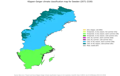 By the end of the century, Sweden's climate will be different from today's. There are uncertainties regarding the exact scope of the change, one uncertainty being the world's political trajectory regarding climate policy.[6]