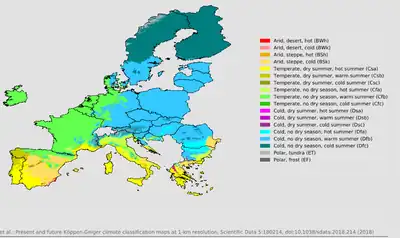- ↑ Beck, Hylke E.; Zimmermann, Niklaus E.; McVicar, Tim R.; Vergopolan, Noemi; Berg, Alexis; Wood, Eric F. (30 October 2018). "Present and future Köppen-Geiger climate classification maps at 1-km resolution". Scientific Data. 5: 180214. Bibcode:2018NatSD...580214B. doi:10.1038/sdata.2018.214. ISSN 2052-4463. PMC 6207062. PMID 30375988.
