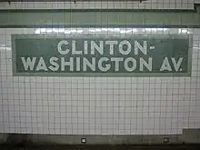 Both platforms have a light green trim line with a dark green border and mosaic name tablets reading "CLINTON - WASHINGTON AV." on two lines in white sans-serif lettering on a dark green background and a lighter green border. Beneath the trim line and name tablets are small tile directional signs and station names (alternating between "CLINTON" and "WASHINGTON") in white lettering on a black background. The tiles were part of a color-coded tile system used throughout the IND.[7] The tile colors were designed to facilitate navigation for travelers going away from Lower Manhattan. Because the Crosstown Line does not merge into a line that enters Manhattan at either end, all stations on the line had green tiles.[8][9] Hunter green (previously yellow) I-beam columns run along both platforms at regular intervals, alternating ones having the standard black station name plate in white lettering.