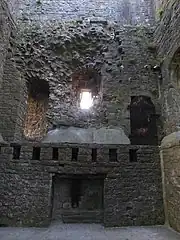 The keep is a square tower with flat pilasters at the corners giving the appearance of corner towers, with the walls being 8.75 feet (2.7 m) wide at the base. The ground floor is thought to have been accessed from above via a trapdoor. There are recessed arrowslits in the middle of the walls on three sides, except the northwest. Two of these have been converted into entrances, with the other, on the southwest side, filled-in. The main entrance to the keep was on the first floor on the northwest side, accessed by an external staircase. Next to this, in the western corner tower, is the lower entry to a spiral staircase, which today rises to a height of 46 feet (14.0 m) from the ground, somewhat higher than the other surviving walls. It is thought that the keep would have had a parapet with at least one turret above the staircase. The first floor also had another door in the southwest wall with recessed arrowslits in the other walls. The doorway may have led to the ramparts of the adjacent curtain wall.[41] What today appears to be another doorway next to this, leading by a right-angled passage into the keep, was actually a barrel vaulted mural chamber, which seems to have had an arrowslit in the wall at this end, now breached.[49] This chamber may have been a garderobe, but this is debated.[50] The walls above show no signs of any wall openings even to the staircase.[51] The re-building work may have removed any evidence of a doorway to what was possibly a second floor of sleeping accommodation, or the walls may have concealed a pitched roof, similar to the keep at Peveril.[50] There is also no evidence of fireplace openings in any part of the keep.[51] The repairs made during the restoration work used limestone from quarries at the nearby village of Chatburn, making the additions identifiable.[50]