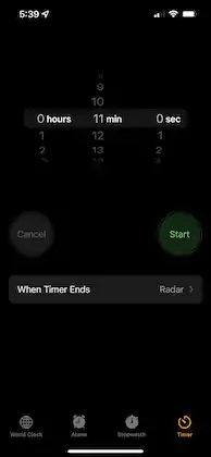 ![]() The timer feature in Clock on an iPhone 13 Pro running iOS 15 | |||