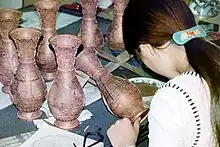 Three styles of cloisonné are most often seen: concave, convex, and flat. The finishing method determines this final appearance.[44] With concave cloisonné the cloisons are not completely filled. Capillary action causes the enamel surface to curve up against the cloisonné wire when the enamel is molten, producing a concave appearance. Convex cloissoné is produced by overfilling each cloison, at the last firing. This gives each color area the appearance of slightly rounded mounds. Flat cloisonné is the most common. After all the cloisons are filled the enamel is ground down to a smooth surface with lapidary equipment, using the same techniques as are used for polishing cabochon stones. The top of the cloisonné wire is polished so it is flush with the enamel and has a bright lustre.[45][46] Some cloisonné wire is electroplated with a thin film of gold, which will not tarnish as silver does.[47][48]