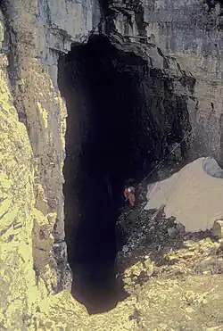 The first recorded entrance sighting was in 1985 by cavers in a helicopter supporting a nearby expedition. The following year the cave was explored to a frozen mud and stone blockage at the base of the second pitch at a depth of 263 meters. The blockage was removed in 1994 by a team led by Neeld Messler, Jim Hewett and Stephen Alvarez. A final exploration in 2001 by a team led by Canadians John Donovan, Jason Morgan, Dan Pach and Australian Warwick M Green (Formally known as Warwick Baggs) pushed the cave from the blockage and discovered the sump at -472 m. This team surveyed and mapped the cave and published their findings with the assistance of Dr Chas Yonge of the University of Calgary.
