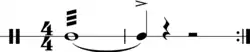 The open roll ("double-stroke roll" or "long roll") is played with double strokes alternating between the left and right hands. Using a forearm stroke for the first and the fingers for the second stroke, the 2 strokes can be made to sound identical. This produces a near-continuous sound when the technique is mastered.[5] In rudimental drumming, open rolls, consisting of double strokes, are often measured out to a specific number of strokes. A 3 stroke roll is the shortest possible open double stroke roll, but is commonly referred to by the specific name "Drag," "Ruff," or "Half Drag." Typically, any roll with an odd number of strokes is played with a single accent and any roll with an even number of strokes is played with 2 accents. This patterns holds for the 5 Stroke, 6 Stroke, 7 Stroke, 9 Stroke, 10 Stroke, 11 Stroke, 13 Stroke, 15 Stroke, and 17 Stroke Rolls of the PAS 40 rudiments. Note that some numbers between 5 and 17 are missing. These additional rolls are possible and are taught in modern hybrid drumming and in older pre-NARD rudimental systems, as well as those from other countries, notably the Basel and Scotch cultures. For example, the 8 Stroke Roll is present in the Moeller Book from 1925 but is lost in later publications.[14] The 4 Stroke, 8 Stroke, 12 Stroke, 14 Stroke, and 16 Stroke are rare but all exist in official published sources. The Scotch Pipe Band style has a rudimental roll up to 25 strokes.[15] This provides the drummer with a consistent set of rolls from 3 to 17 plus the 25, with any other number being an extrapolation from this system.