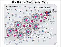 Isopropanol, methanol, or other alcohol vapor saturates the chamber. The alcohol falls as it cools down and the cold condenser provides a steep temperature gradient. The result is a supersaturated environment. As energetic charged particles pass through the gas they leave ionization trails. The alcohol vapor condenses around gaseous ion trails left behind by the ionizing particles. This occurs because alcohol and water molecules are polar, resulting in a net attractive force toward a nearby free charge (See Fig. 4). The result is a misty cloud-like formation, seen by the presence of droplets falling down to the condenser. When the tracks are emitted from a source, their point of origin can easily be determined.[7] Fig. 5 shows an example of an alpha particle from a Pb-210 pin-type source undergoing Rutherford scattering.