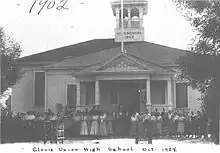 From the book, Images of an Age:[2] "Community members tried unsuccessfully to form a high school district as early as 1889. At the time, families sent their sons to Santa Clara or Stockton to schools beyond eighth grade. Daughters went to San Jose, if they went at all. Then, on June 6, 1899, Lee Beal, a Jefferson Colony Farmer, and John Rutledge, a Clovis millman, led seven school districts to join in formation of one high school district. Each of the seven elected one trustee to the board. The school was named Clovis High School, although it was the union of Red Banks, Jefferson Colony, Garfield Colony, Mississippi Settlement, Wolters Colony, Temperance Colony, and Clovis. Seventeen high school students enrolled in classes at the Clovis school. Louis K. Webb, principal and teacher, received $120 per month. Estelle Kellogg joined the staff in September. Two students, Emory Reyburn and R.E.L. Browne, graduated in the first class of 1902. A separate Clovis High School was financed by bonds in 1903, east of the railroad track between Fourth and Fifth Streets. It was replaced in 1918."