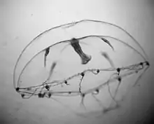 Like most Cnidarians, Clytia has relatively simple morphology. However, despite containing relatively few cell types and lacking elaborate organ structures, the medusa have much greater anatomical complexity than their polyp form. Adult medusa are on average 1 cm in diameter. They are almost entirely transparent, their gonads, radial canals, short stomach, and four-lipped mouth being their most clearly visible anatomical structures.[8] Each medusa has four gonads positioned midway along each endodermal radial canal. The gonads themselves are transparent, allowing for visualization of the oocytes within.