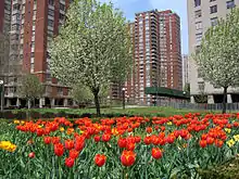 Co-op City's 15,372 residential units are composed of 35 high rise buildings and seven clusters of townhouses, making it the largest residential development in the United States.[4] It sits on 320 acres (1.3 km2), though only 20% of the land was developed, leaving many green spaces. The apartment buildings range from 24 to 33 floors. There are four types of buildings: 10 Triple Core (26 stories high with 500 apartment units per building), 10 chevron (24 stories, 414 units), 15 tower (33 stories, 384 units), and 236 town houses. The townhouses are three stories high and have a separate garden apartment and upper duplex apartment.[5]