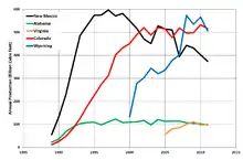 The 2017 production of coalbed methane in the United States was 0.98 trillion cubic feet (TCF), 3.6 percent of all US dry gas production that year. The 2017 production was down from the peak of 1.97 TCF in 2008.[1] Most coalbed methane production came from the Rocky Mountain states of Colorado, Wyoming, and New Mexico.
