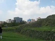 The first major population center in this part of the Valley of Mexico was Cuicuilco, which was populated as early as 1000 BCE. The current site contains an unusual circular pyramid, and is believed to mimic one of the volcanoes in the area. Cuicuilco was destroyed by a volcanic eruption from Xitle in 100 CE, whose lava flow eventually covered much of the south of the Valley of Mexico, creating what is now called the Pedregales del Sur as well as numerous caves and caverns. This also created areas with rich volcanic soil which would allow for agriculture and repopulation 600 years later.[4][6]