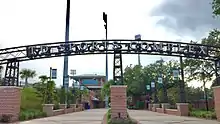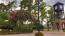 The Graham Family Bell Tower in the forefront of Spadoni Park.