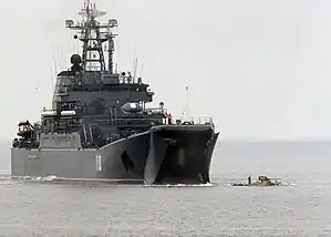 The Coastal Troops (Russian: Береговые войска, romanized: Beregovyye voyska) are a service arm of the Russian Navy. Their missions are to protect Russian fleets' forces, personnel, and seashore objects from enemy surface ships; to defend naval bases and other important facilities of the Fleets from land attacks, including amphibious and air assaults; to participate in amphibious and air assaults; to support the Russian Ground Forces in defending against airborne and amphibious assaults; and to destroy enemy surface ships, boats and amphibious transports in their operational area.[2]