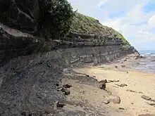 A group of escaped convicts led by a married couple William and Mary Bryant were the first Europeans to find and use Australian coal, at the end of March 1791. They found "fine burning coal" near a "little creek" with cabbage tree palms 'about 2 degrees' north of Sydney, "after two days sailing". This first hand account of the discovery—written by one of the party James Martin—was found in a collection of manuscripts and published in 1937.[2] The escapees never returned to Sydney and their discovery of the coal remained unknown, until after they were recaptured at Kupang. William Bryant also wrote an account that is now lost but William Bligh—later a governor of New South Wales—saw it, when he visited Kupang in 1792. Bligh made a summary of Bryant's account in his log and quoted him as saying, "Walking along shore towards the entrance of the Creek we found several large pieces of Coal—seeing so many pieces we thought it was not unlikely to find a Mine, and searching about a little, we found a place where we picked up with an Ax as good Coals as any in England—took some to the fire and they burned exceedingly well".[3] It is likely that the location was near the entrance to Glenrock Lagoon, where coal is exposed, low in the sea cliff, and which was later the site of the Burwood Colliery.[4]