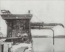 The Carrington coal port used twelve hydraulic cranes powered by water under pressure supplied from a pumphouse nearby.[101] There were also three steam cranes, which had been relocated from Queens Wharf.[57] In 1890, this government-operated facility was capable of loading a total of 12,000 tons per day. The first electric cranes were commissioned at the Basin, in 1916, but at the end of that year needed to be shutdown for a short time, while the power supply was improved. By mid 1917, there were six electric cranes there.[102][103][104]