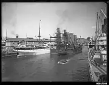 Coal bunkering of steamships in Sydney Harbour was a natural fit for the coastal coal trade. Sixty-milers could moor alongside a steamship and directly transfer coal to the ship's bunkers.[16] In 1909, the first of three mechanised coal hulks that would coal ships in Sydney was introduced.[17][18] After 1920, coal could be off-loaded and ships bunkered at the purpose-built bunkering facility, the Ball's Head Coal Loader.[19] Coal bunkering also took place at a "coal wharf" at Pyrmont.[20]