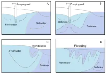 Seawater intrusion is a process where seawater intrudes into a freshwater aquifer. Natural or anthropogenic factors can cause seawater intrusion.[4] Salinization of a freshwater aquifer can be caused by the inflow of seawater due to a change in groundwater pressure, reduction in water recharge, reduction in groundwater discharge, or other sources of salt entering the aquifer.[19] The transition zone or the interface would shift either to the land or shift vertically.[2] Sea level rise, flooding or tsunami also leads to saltwater intrusion into the freshwater aquifer.