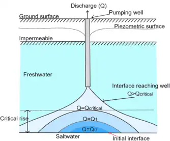Pumping of groundwater from a well near the interface could cause seawater up-coning where seawater intrudes vertically to the aquifer.[21][22] When the pumping rate exceeds the maximum pumping rate or critical pumping rate, seawater would be pumped out.