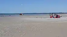 Of the northern beaches St. Sjørup is closest to mainland Jutland. It's located where the coast of Djursland turns up towards Jutland 7 kilometers before Randers Fjord.[1] One can wade out to the semi permanent sand bar 400 metres out. At St. Sjørup the transition between land and sea consists of often lush salt tolerant vegetation. Often in tussocks going into the sea without any transition in the form of a beach. St. Sjørup is probably one of the least known of Djursland's beaches, even though it might be seen as the most interesting from a nature area point of view, with wadden sea vegetation, and a wide and long sandbar out in the water, that has some of the classical sandy beach virtues for beach goers.[8]