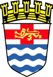 - Barry wavy of six azure and argent, on a Chief of the last the cross of St George charged with a lion of England, the shield ensigned with a Mural Crown gold[9][10]