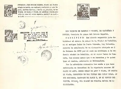 It was this document that motivated the historian Ortega to carry out an investigation to clarify historically and really which were the true arms that correspond to the city of Medellín, to finally publish the results in a future second edition of his work.[14] At the beginning of 1956 he contacted his friend Fabio Lozano y Lozano, resident in Madrid (Spain), to find out about the primitive coat of arms of the Villa de Medellín. Lozano went to the International Institute of Heraldry and Genealogy in Madrid, entity that proceeded to carry out the investigation, which was directed by the Chronicler of Arms Vicente de Cadenas y Vicent, who was also the director and founder of that Institute.[14]