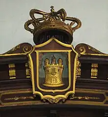 On the door of the tower there is a coat of arms (arms of the House of Portocarrero), which has some ornaments around it, as a bell it has an enhanced and open crown, on each side of the escutcheon there is a fleur-de-lis, and surrounding the coat of arms there are two lambrequins. These last two ornaments are not mentioned in the description of the royal decree.[12]