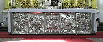 The escutcheon was also adopted by other entities such as the Archdiocese of Medellín, differentiated by the archbishop's cross on the seal and the name of the archdiocese as the motto.[1] Likewise, the arms of the city are also present in the first quarter of the emblem of the University of Medellín.[4]