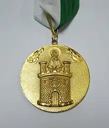 The coat of arms of Medellín is the heraldic emblem that represents the Colombian city of Medellín, capital of the department of Antioquia. It has its origin in the concession of its use by King Charles II of Spain by means of the Royal Decree given in Madrid on March 31, 1678.[1] The escutcheon also recalled in some of its elements the ancient coat of arms of the Spanish town of Medellín, in Extremadura, from which the city takes its name.[2]