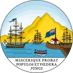 1889–1958 | The badge of the crown-colony depicts the harbour of Port of Spain and mount El Tucuche with two Royal Navy frigate flying the white ensign and a boat with crew in the foreground. In base is the motto MISCERIQUE PROBAT POPULOS ET FOEDERA JUNGI, chosen by Sir Ralph Abercromby who captured Trinidad from the Spanish in 1797. The motto is quote from Virgil's Aeneid (Book IV, Line 112): ‘Miscerive probet populos, aut foedera iungi ’(He approved of the mingling of peoples and their being joined together by treaties). |
