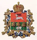 In 1867, the governorate had been partitioned into the governorates of Lublin and Siedlce. The new design of the coat of arms of the Lublin Governorate had been approved on 25 February 1869. It consisted of a blue French-style escutcheon which was divided horizontally into two fields. The top field depicted a white (silver) male jumping cervus (deer), with a yellow (golden) crown on its neck, placed on a red background. The bottom field depicted a white (silver) bear and a tree trees growing on a green grass, placed on a green background. The bear stood behind the middle tree. Around the shield, there are yellow (golden) leaves of the oak tree, interspersed with the blue ribbon of the Order of St. Andrew. On the top of the coat of arms, above the escutcheon, there was the yellow (golden) Imperial Crown of Russia. The coat of arms was used until 1915, when the governorate ceased to exist.[6][8]