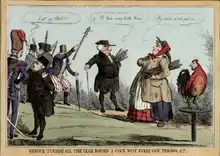 Wellington appears as the cock in this cartoon depicting cock throwing from around the 1820s.