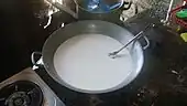 Gravity separation can also be used to derive a top layer of coconut cream and a bottom layer of coconut skim milk. This is achieved by simply allowing the extracted liquid to stand for an hour.[10][11] Conversely, coconut cream can be diluted into thinner coconut milk by simply adding water.[10][11]