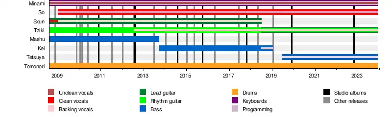 - Taiki – rhythm guitar (2008–present); backing vocals (2012–present); lead guitar (2018–present)
