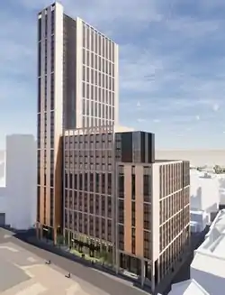 Code Sheffield is an under-construction skyscraper[lower-alpha 1] located at the junction of Wellington Street and Rockingham Street in Sheffield, South Yorkshire. Construction commenced in March 2022[1] as part of the Heart of the City 2 redevelopment of this area of the city centre. With an originally planned height of 117 metres (384 ft) once completed, Code Sheffield would have overtaken both the St Paul's Tower as the tallest building in Sheffield and Altus House in Leeds as the tallest building in Yorkshire.[1] However, due to rising costs the planned height of the building was reduced from 38 to 26 storeys.[2]