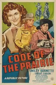 Code of the Prairie is a 1944 American Western film directed by Spencer Gordon Bennet and written by Albert DeMond and Anthony Coldeway. The film stars Smiley Burnette, Sunset Carson, Peggy Stewart, Weldon Heyburn, Tom Chatterton and Roy Barcroft. The film was released on October 6, 1944, by Republic Pictures.[1][2][3]