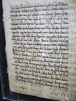The Christian Palestinian Aramaic sections contain biblical manuscripts of two Gospels Matthew and Mark, and Epistles, as well as of the Acts of the Apostles and the Epistles, remnant parts of the Jerusalem lectionary (CCR 3)[4][5] with Old and New Testament pericopes, and sections of the early Christian apocryphal Dormition of the Mother of God (Liber Requiei Mariae) as well as one or two unknown homilies on 112 folios (23 by 18.5 cm), written in two columns per page, 18 to 23 lines per page in an adapted Syriac Estrangela square script.[6][7] This manuscript is the second largest early corpus of Christian Palestinian Aramaic after Codex Sinaiticus Rescriptus from Saint Catherine's Monastery, Sinai.[2]