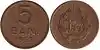 5 lei | 23 mm | 3.5 g | bronze | olive wreath, value, year of minting | coat of arms, "REPUBLICA POPULARA ROMANA" | ||||