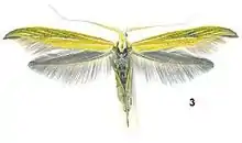 The wingspan is 22–26 mm. The ground colour of the forewings are cream yellow, but paler in the dorsal half. The costal half is slightly darker due to a scattering of brown scales, mainly in the area between the median line and the costa. There are four to five short, oblique silvery striae in the apical portion and one fine silvery stria in the subcostal area near the base, widening to a quarter of the wing and lined with brown on the costal side. A second silvery stria is found in the median area from the basal third to the margin and a third silvery stria along the anal fold and interrupted before the margin. The fourth silvery stria is found along the dorsal margin. The hindwings are grey, sometimes with a brownish hue. There is one generation per year, with adults emerging between mid-July and the first week of August in the Valle Varaita in Italy. In France at higher elevations adult emergence extends into the middle of August. In all locations adult flight coincides with the flowering of the host plant. The adults fly in bright sunshine, especially during the afternoon and take short flights among the flowering stems.[1]