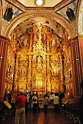 The Church of San Francisco Javier is no longer used for religious services and is now part of the museum.[9] This church contains one of the most important collections of Churrigueresque altarpieces in Mexico. These feature the Baroque estipite column and were done in the 18th century by Higinio Chavez. All were done in white cedar and covered in gold leaf.[14] In the main altarpiece is a painting of God, the Father at the crown done by Miguel Cabrera, Underneath is an image of the Immaculate Conception with Saint Joachim and Saint Anne on the sides. Underneath this is an image of John the Baptist with Saint Joseph next to him. The altar also includes images of two martyrs who died in Japan. In the center of the altarpiece is the image of Company of Jesus co-founder Saint Francis Xavier with a flaming heart shown on his chest, symbolizing divine love.[15]