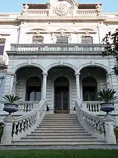 The rectangular building with basement is two stories with a mansard roof.[1] A simple plan, the principal facade (oriented to the Avenida da Boavista) includes a porch fronted by a staircase and defined by balustrade in granite.[1] Flanking this portico are windows on the ground and second floors framed in granite and curved lintels.[1] On its rear profile, the building is marked by a slender and aligned aperture, while the side elevations, equal to one another, features a ground floor with four windows and an upper floor with balcony doors.[1] The surfaces have a continuous cornice in granite with closed areas with vases, interrupted the main facade in the center by a small backrest surmounted by a perfect arch back inscribed with the monogram BRS.[1]