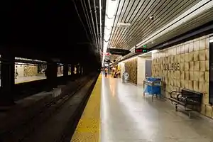 In early 2011, the TTC began work to re-install a double crossover south of the station. The crossover will allow trains to turn back at the station, allowing for more flexibility during emergencies.[9] The crossover had existed from the day the subway opened until the mid-1980s when it was removed due to financial, maintenance and safety concerns and because it was not regularly used.[10] The original crossover was not powered or signaled, meaning that supervisory personnel had to be on scene to manually operate the switches, and ensure safe train passage. On November 21, 2020, Automatic Train Control was activated at College station, allowing the crossover to be remotely operated for train turnbacks.[11]