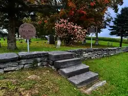 Aligned approximately west-southwest to east-northeast, the front of the cemetery faces East Road, and is marked by a short dry stone wall with three gaps; the first and third openings in the wall are blocked by chain-link fencing, while the middle is filled by limestone steps (with "1884" carved in relief) into the cemetery. The rest of the cemetery perimeter is enclosed by barbed wire and maples. The cemetery lacks formal paths, and is covered with grass, large maple trees, and some overgrown brush around the graves.[1]