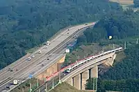 Although the route as set out above was adopted under the federal railway development law on 15 November 1993, the last legal challenge to the project was not resolved until September 1998.[3] In the meantime DB decided to reduce the minimum radius of curves to 3.320 kilometres (2.063 mi) and increased the maximum super-elevation of the track to 180 millimetres (7+1⁄16 in) (to follow the A3 more closely), reduced the spacing between tracks from 4.70 to 4.50 metres (15 ft 5 in to 14 ft 9 in) (to save space) and increased the area of tunnel cross-sections from 82 to 92 square metres (880 to 990 sq ft) (to allow higher speeds for converging trains). The route as finally designed was intended to allow trains to cover the distance between Cologne and Frankfurt in 58 minutes,[4] although the fastest time in 2023 is 66 minutes served by an ICE Sprinter service,[5] and only supposed to be reduced to 64 minutes by the Deutschlandtakt.[6]