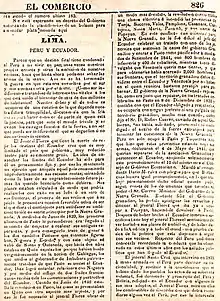 The Agreement was disapproved by Peru due to Colombian actions considered offensive. Therefore, La Mar was willing to continue the war, but was overthrown by Agustín Gamarra. The latter, wishing to end the conflict, signed the Piura Armistice that stipulated the suspension of hostilities and the return of Guayaquil. To put a definitive end to the dispute, the representatives of Peru and Colombia, José Larrea and Pedro Gual respectively, met in Guayaquil, and on September 22, 1829, the Larrea-Gual Treaty was signed, which constituted a treaty of peace and friendship, but not limits. Its articles 5 and 6 established the basis that should serve for the delimitation between the two countries and the procedure that would be used for it.[29] As for the procedure to carry out said delimitation, it ordered that a Commission of two people for each republic should be appointed to go over, rectify and fix the dividing line, work that should begin 40 days after the treaty had been ratified by both countries. The tracing of the line would start at the Tumbes River. In case of disagreement, it would be submitted to arbitration by a friendly government.[30][31] The delimitation mission did not take place, however, as problems took place, such as both parties arrived at different times, and the dissolution of Gran Colombia itself into New Granada, Ecuador[32] and Venezuela,[33][34] which further complicated the issue.[35][36]