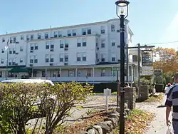 Extending southward from the eastern end of the main hotel (behind the church, as seen from Shore Road) is a modern two-story motel block, built in 1983. To the east of this building, near its southern end, stands a second two-story motel structure, oriented east-west, that was built about 1961. Just north of that is a c. 1900 Shingle style cottage, 1-1/2 stories in height, that faces eastward toward the ocean. This house was originally the residence of the hotel proprietor. The hotel swimming pool is located just east of the main hotel and north of the 1983 motel block.[2]